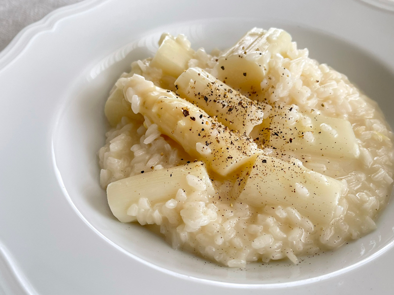 ◆茹で汁を使ってリゾットにし、茹でたアスパラも刻んで加え、パルミジャーノをたっぷり混ぜ込む。
