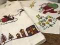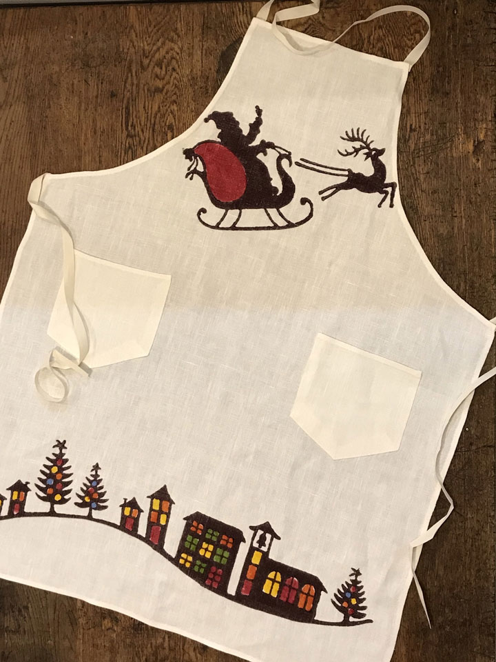 サンタクロースやクリスマスツリーが描かれたエプロンとディッシュクロスはプレゼントにもお勧めです。