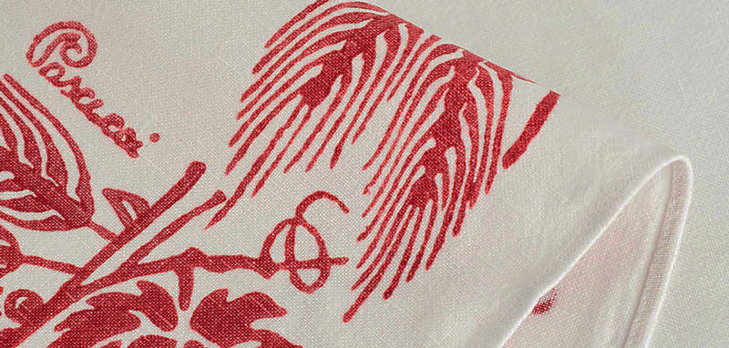 古来より伝わる麦や葡萄、鶏等々のモチーフを木彫りしたものに染料をつけ、ひとつひとつ丁寧に麻布にスタンプする事で絵柄を出していきます。